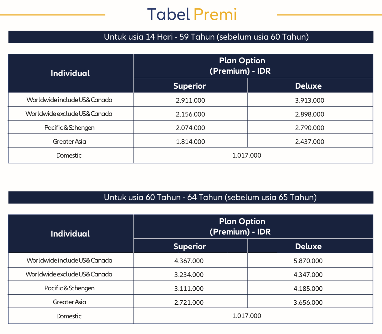 Jika memilih paket/plan Deluxe maka itu sudah termasuk paket/plan Domestik. Begitu juga jika memilih paket/plan Superior juga sudah termasuk Paket/plan Domestik. Ini artinya di Asuransi Perjalanan Tahunan, jika memilih paket/plan internasional baik yang Worldwide Include USA/Canada, Worldwide Exclude USA/Canada, Pasific & Schengen, Greater Asia, itu semua sudah termasuk paket/plan Domestik.