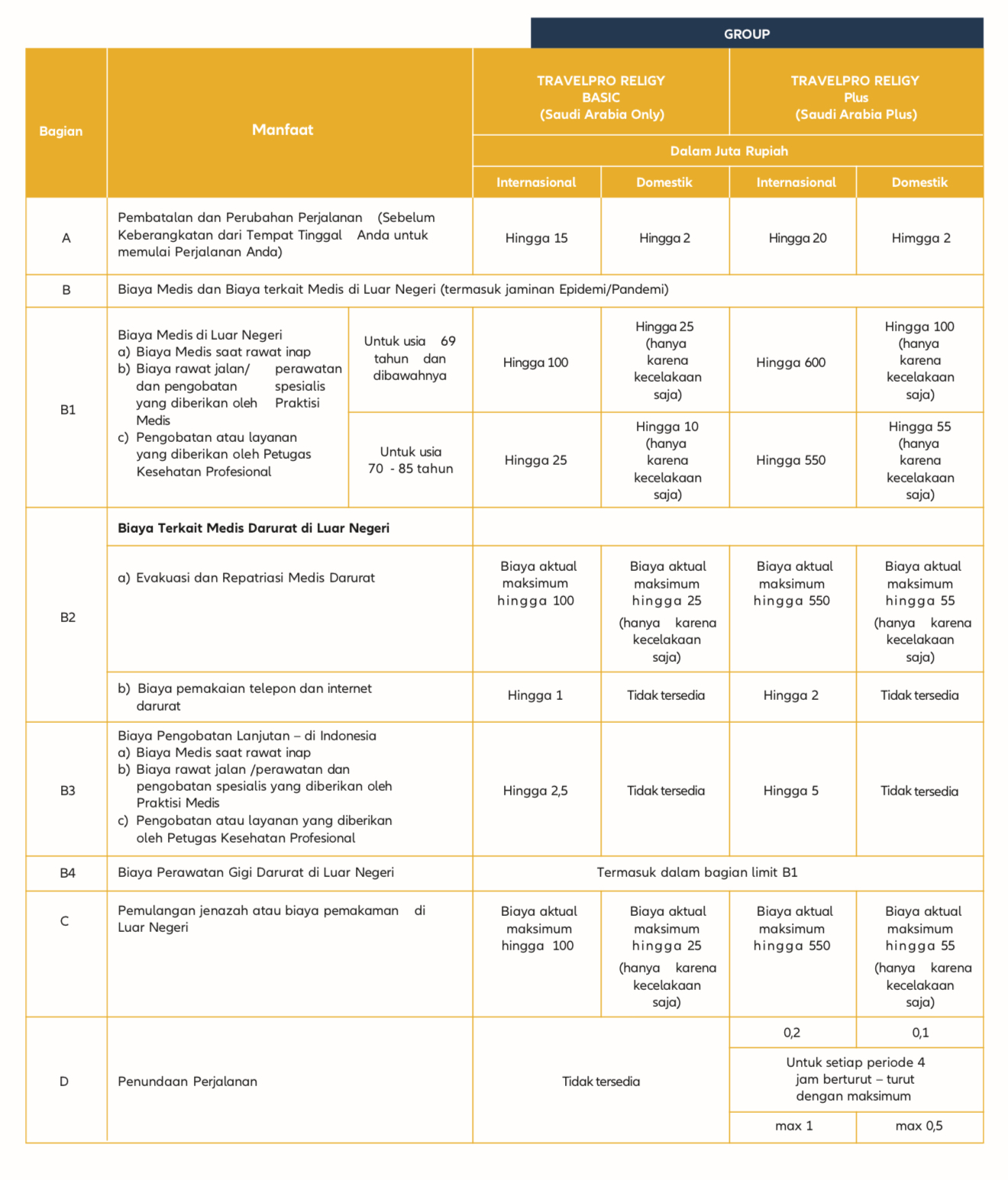 Tabel Manfaat Asuransi Perjalanan Umroh Grup Allianz/Allianz Group Umrah Travel Insurance TravelPRO Religy Umroh